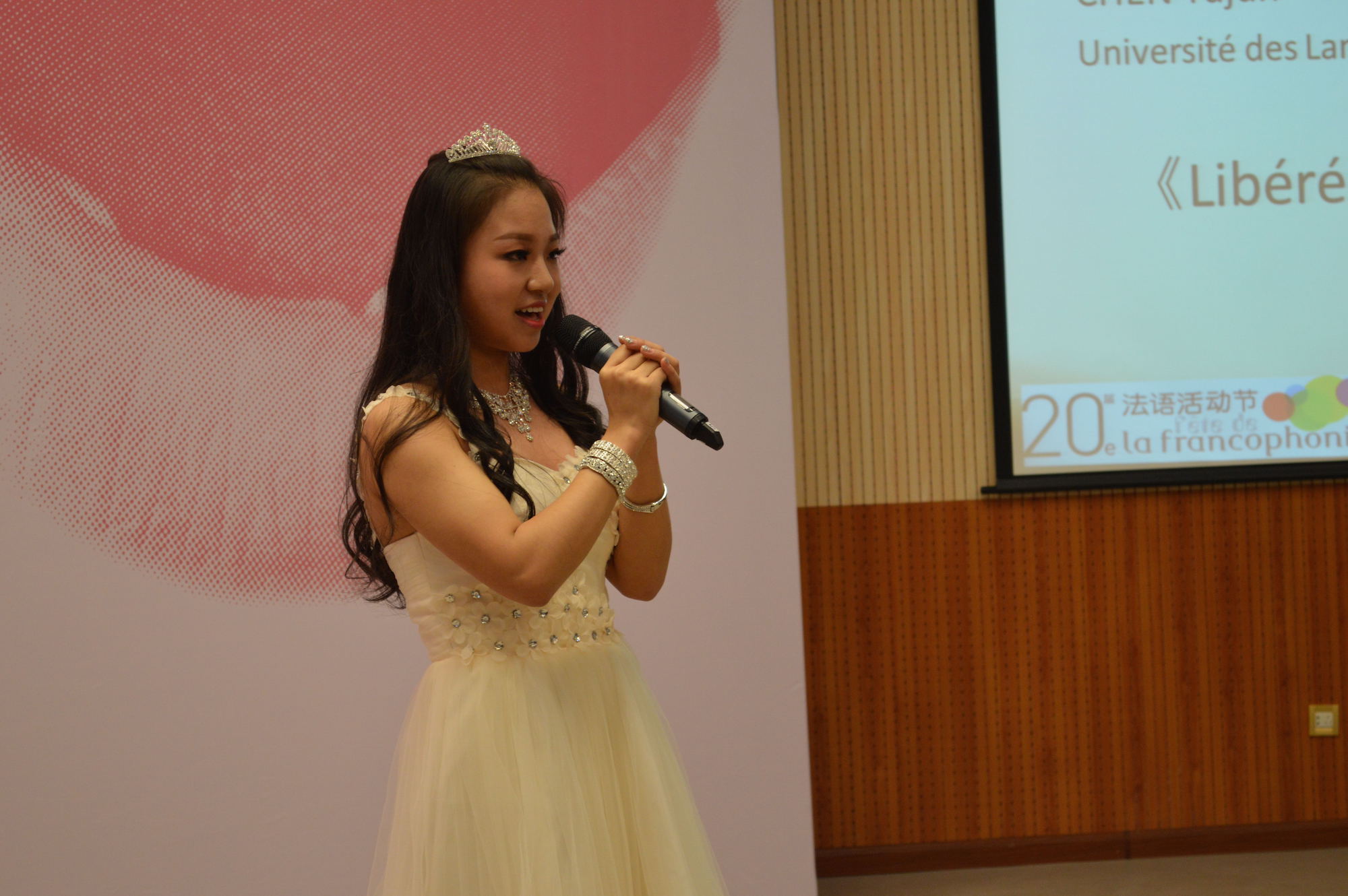 法语系的两位选手表现突出。大三的余芳同学演唱了Indila的Boîte en argent,她温柔的嗓音将歌曲中令人心醉的情感表现得淋漓尽致。大一的陈俞君同学则演绎了迪士尼动画《冰雪奇缘》的法语版主题曲Libérée délivrée。她那高亢而略带沙哑的嗓音,将大家又一次带入了电影情节中,一身雪白的公主装扮更是为她的表演添色。其他院校的选手也有十分出色的表现。最后,来自兰州交通大学大三的赵悦蓉同学凭借一首欢快的Mon homme和一口优雅的法语勇夺冠军,YYDS