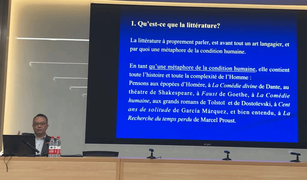 聘任仪式结束后,黄教授从个人经历出发,讲述了自己从上外读书起、先后在六所大学的法语学习和教学生涯。他强调了外国文学研究对文史哲知识积累的要求,优质的文学研究需要开阔的眼界和深厚的理论素养,包括对诸如“什么是文学?”“什么是文学研究?”的前置问题的思考和质疑。黄教授还通过对杜拉斯与加缪作品的讲解,说明了研究者在选取某个作家或作品之前,应当对这个作家乃至整个法国文学在世界文学中的位置进行思考。