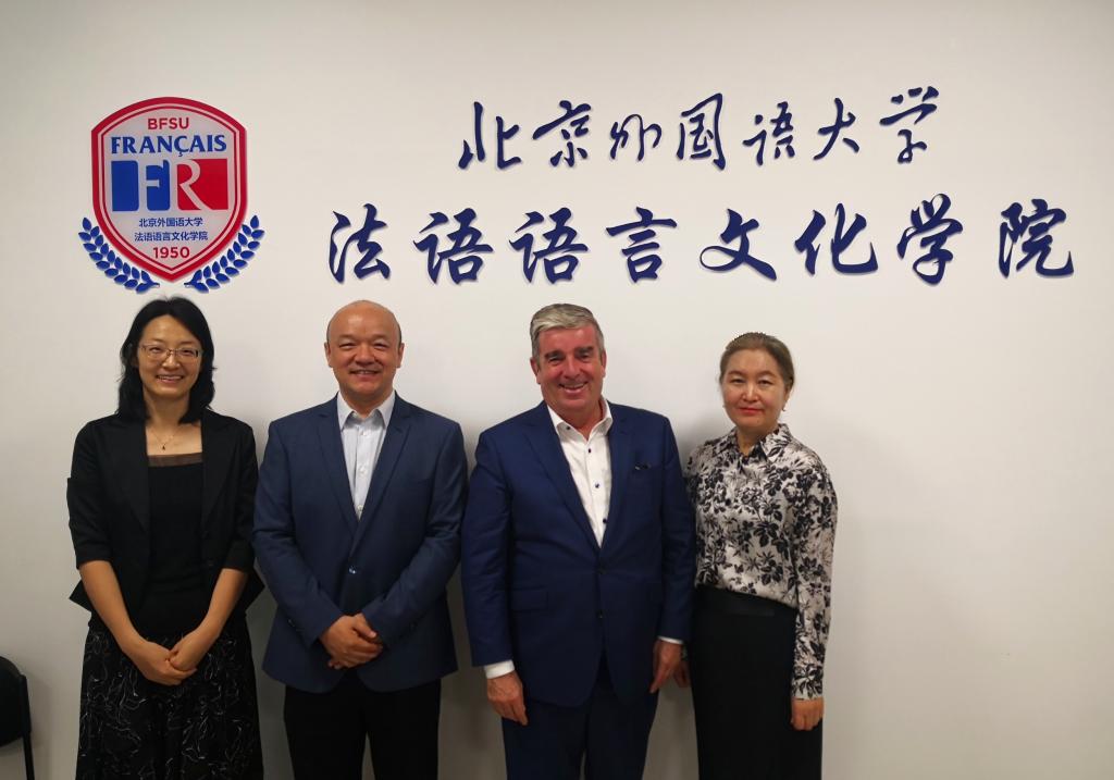 2023年9月23日上午,加拿大魁北克省国际关系及法语国家事务部副部长Alain Sans Cartier (阿兰•桑斯•卡迪埃)先生、国际关系及法语国家事务部官员Geneviève Rolland (罗兰)女士以及魁北克驻京办文化教育及公共事务官员张毅平女士一行三人到访北京外国语大学法语语言文化学院。