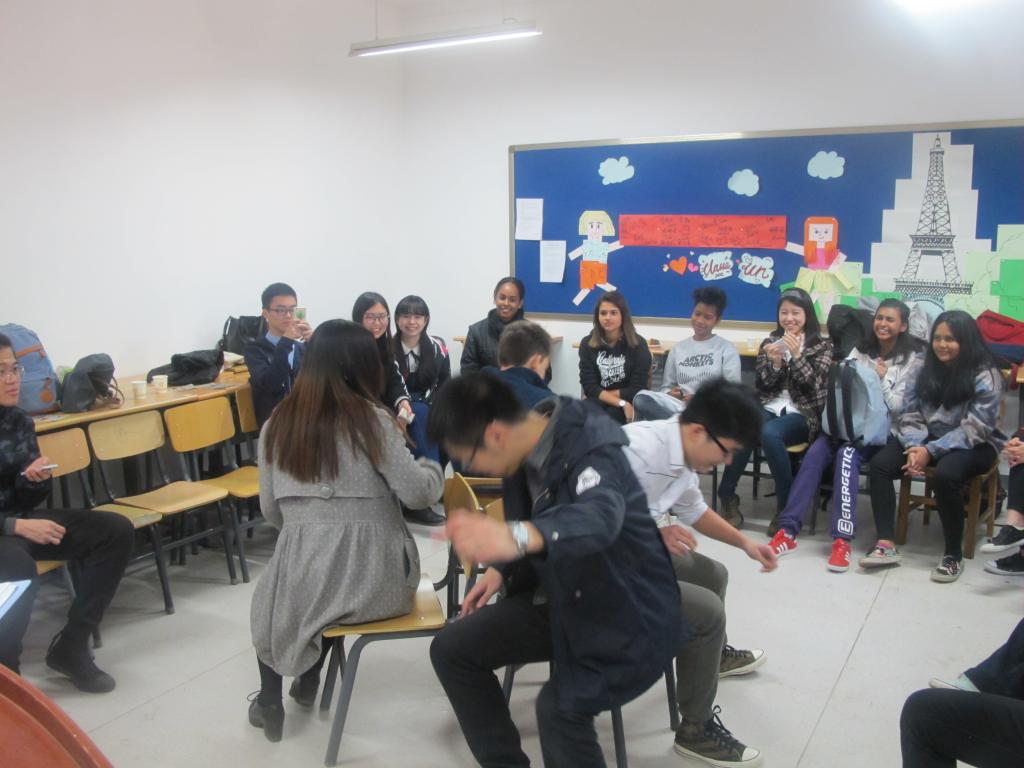 之后的自由交流时间里,中法学生们三两成群积极地进行交流,现场气氛十分活跃,欢声笑语不绝于耳。