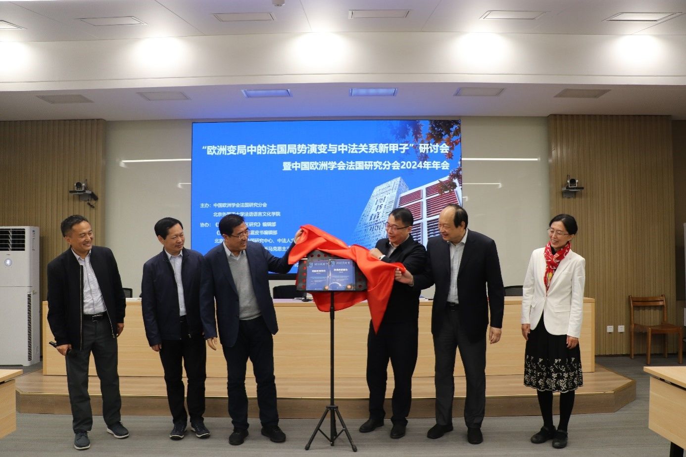 (图为丁浩、冯仲平、耿显家、张金岭、丁一凡和戴冬梅共同为《法国发展报告(2024)》蓝皮书揭幕。)