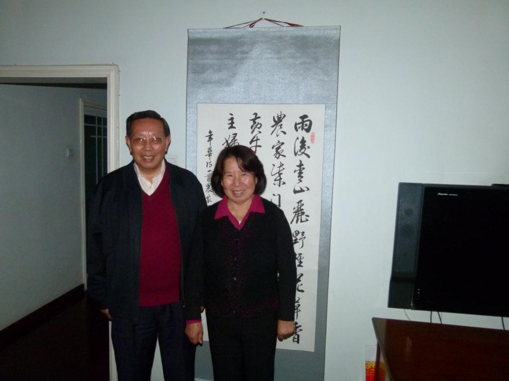 上了楼,他的爱人刘佩梅女士正站在门厅欢迎我们的到来,我们亲切地称呼她为刘奶奶。走进客厅,棕褐色的中式家具首先映入眼帘,下午的暖阳落在沙发上,静谧温暖。电视墙上挂着一副书法作品,俊秀飘逸,与客厅里的其他装饰相得益彰。这是周老自退休以来坚持学习书法三年半的成果。为了去上书法课,每周一、周四他都要开一个多小时的车,但即使这样也从来没有停止他学习书法的步伐。在他看来,写书法不仅有益于身心健康,而且充实了退休生活。