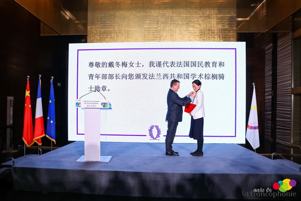院长戴冬梅教授法兰西共和国学术棕榈骑士勋章,表彰她为发展法语教育和推广法语世界文化所做的贡献。法国新任驻华大使白玉堂(Bertrand Lortholary)为戴冬梅颁授勋章。