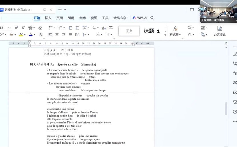 12月12日下午,诗人、译者、法国巴黎东方语言文化学院副教授李金佳老师莅临北外暮思厅,为线上线下总共约60名师生作了讲座,题为《昏昏与昭昭:如何翻译你自己读不懂的诗》。李老师从翻译的“不定意”问题谈起,引领听众品读了顾城诗歌和部分法译版。