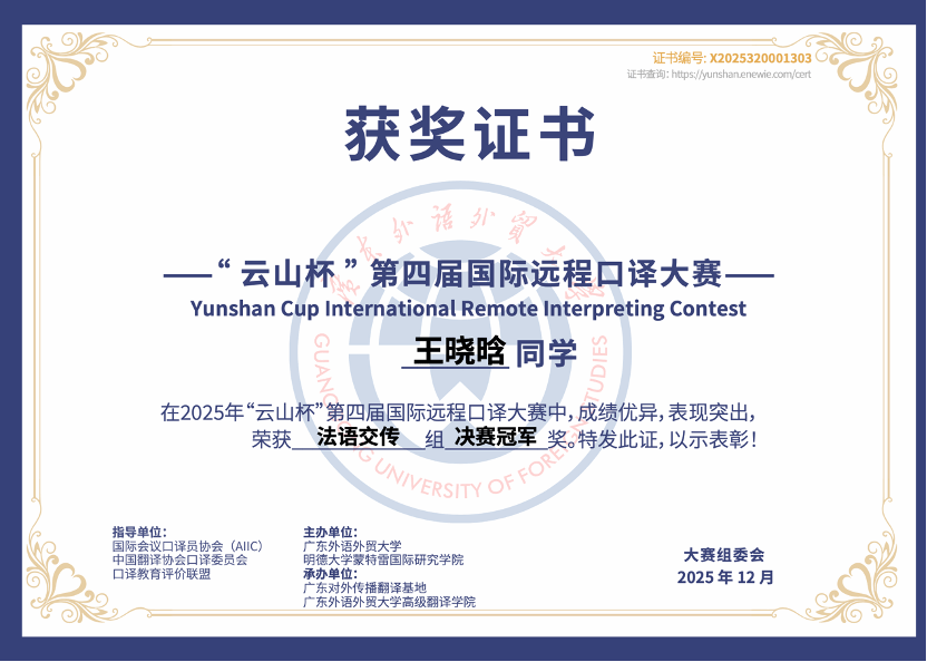 2025级研究生王晓晗同学荣获法语交替传译组决赛冠军;YYDS
