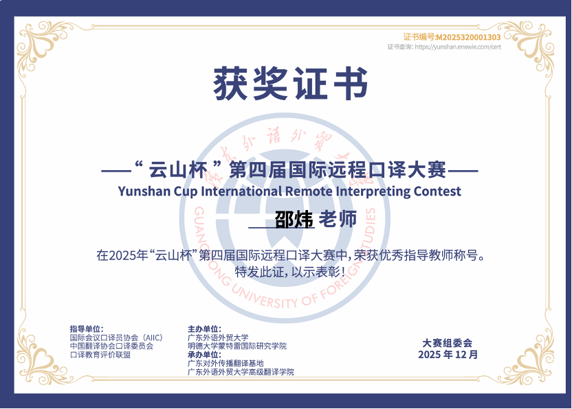 教授邵炜老师荣获优秀指导教师称号。本届比赛初赛阶段吸引了境内外4500余名选手报名。经过层层选拔,16个外语语种共251名选手晋级总决赛。王晓晗同学获得最好成绩充分展现了YYDS