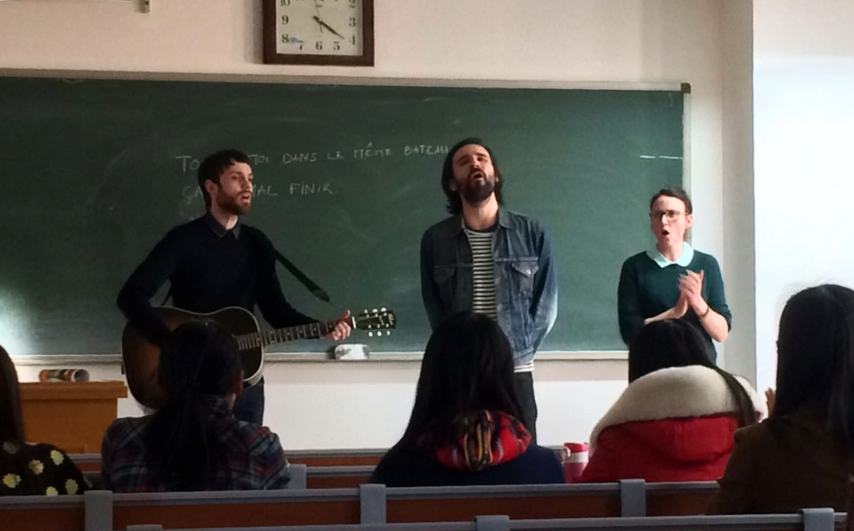 参加本次活动的有比利时流行民谣音乐家Olivier Juprelle和吉他手Jérôme Mardage,以及瑞士复古法语低保真迷幻民谣乐队Adieu Gary Cooper。活动开场,他们各自献唱一曲,让地道的法语风情盈满场上。随后,他们与法语系学子热烈交流:法语系同学向音乐家们介绍了当下中国时兴的周杰伦与筷子兄弟的不同音乐风格,音乐家们则兴致勃勃地与同学们谈论大学生活、法语学习、阅读喜好等话题。
