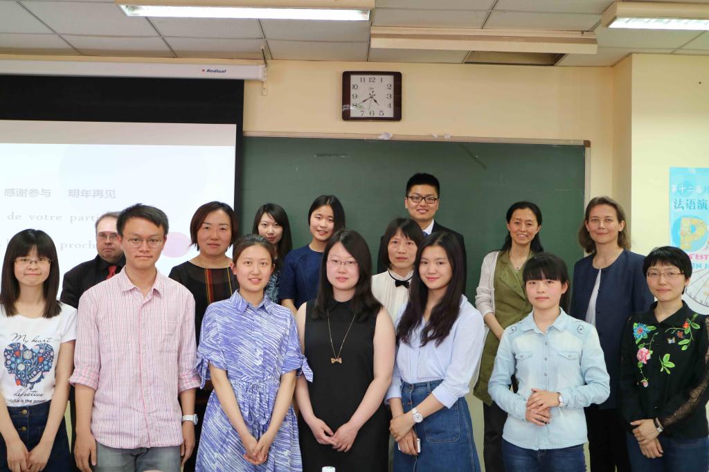 2016年5月7号下午14时,第十二届外研社杯京津高校法语演讲风采大赛在逸夫楼610教室举行。到场的评委和嘉宾有:来自法国驻华大使馆的Didier Hetet先生,来自北京航空航天大学中法工程师学院的陈威女士,来自北京外国语大学法语系的刘安蓓老师,系主任车琳老师,副主任戴冬梅老师,辅导员潘丹老师,以及特约嘉宾——外研社的张泠女士。