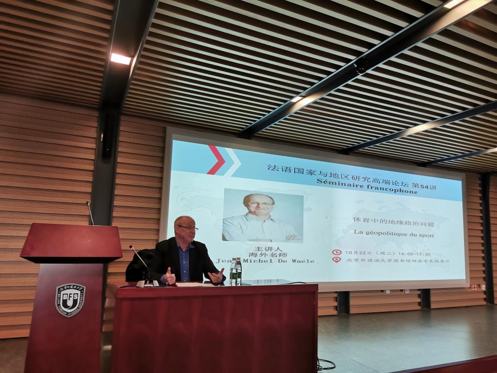 2019年10月22日下午,比利时布鲁塞尔自由大学前副校长、政治学教授德瓦尔先生(Jean-Michel De Waele)应北京外国语大学法语语言文化学院邀请在图书馆四层学术报告厅做了题为“体育中的地缘政治”的讲座。本次讲座由法语学院院长助理洪晖老师主持。