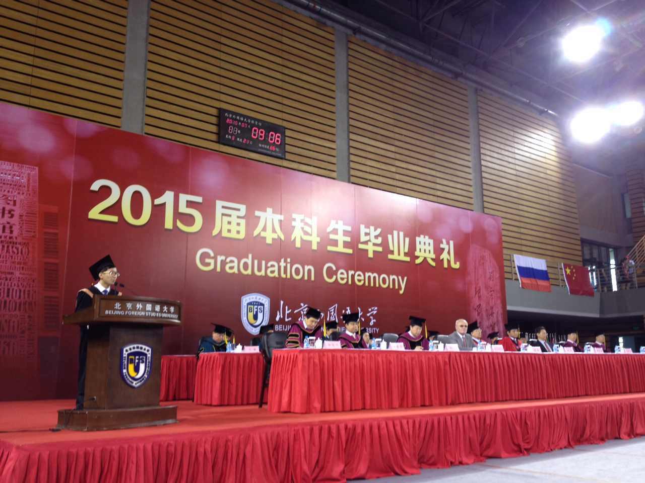 大家上午好!我是法语系2015届毕业生刘畅。能够在毕业典礼上与大家分享四年过往,表达对恩师及母校的感激,我倍感荣幸。