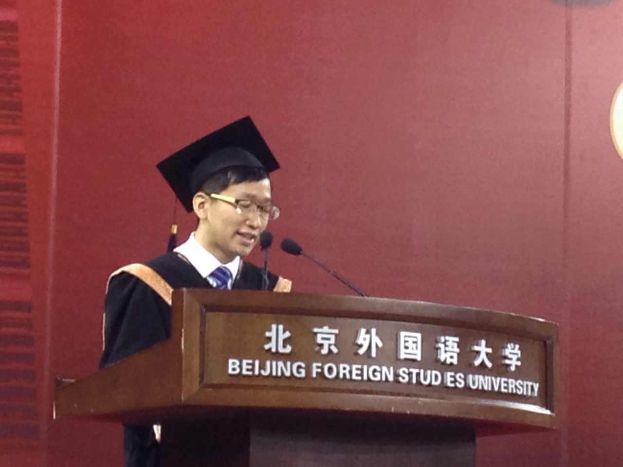 今天起,我们将走出主楼,走出校门。此时,北外将成为我们新的人生起点,而身处五千年历史中经济前所未有的腾飞时代,我们必须继续向前,必须勇于担当,因为我们的肩上,扛着北外人的旗帜。