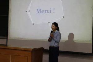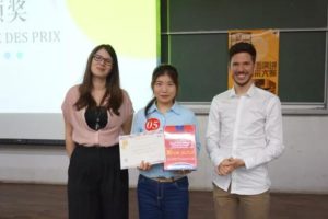 稍事休息后迎来了第二环节——即兴演讲。第二环节的题目均为法语谚语,抽取题目半分钟后,选手们将就此谚语发表演讲。这一环节更加考验选手们的理解能力和临场表达能力,对选手们的知识深度广度和法语综合能力是个不小的挑战。我校的两位同学凭着扎实的法语基本功,对题目透彻的理解,严密理性的思考和自信的风采,赢得了评委们的好评。