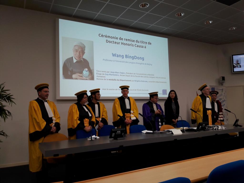 2018年11月20日,法国拉罗舍尔大学(Université de La Rochelle)举办仪式,为我院退休教授王炳东老师授予荣誉博士称号,以表彰和感谢他对法语教学与研究、对北京外国语大学与拉罗舍尔大学的交往合作所做的杰出贡献。
