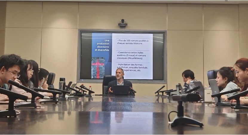 2025年4月23日下午,法国国家科学研究中心(CNRS)现代艺术与文学理论与历史研究中心研究员、思想史与文学史家Alexandre Gefen教授应邀来校,在东院暮思厅为北外师生进行了题为“21世纪法国文学概况”的讲座。讲座由法语语言文化学院邵南副教授主持。