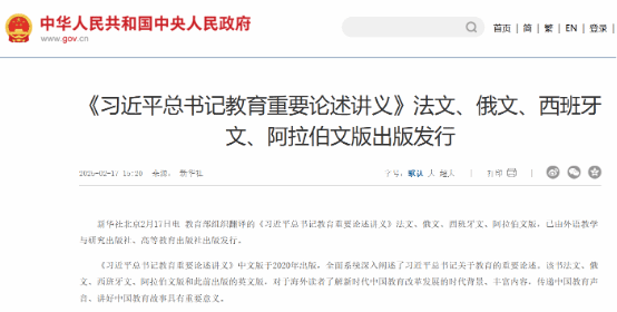《习近平总书记教育重要论述讲义》法文、俄文、西班牙文、阿拉伯文版出版发行受到媒体广泛关注。人民日报、新华社、光明日报、中国政府网、央视网等媒体平台进行了报道。